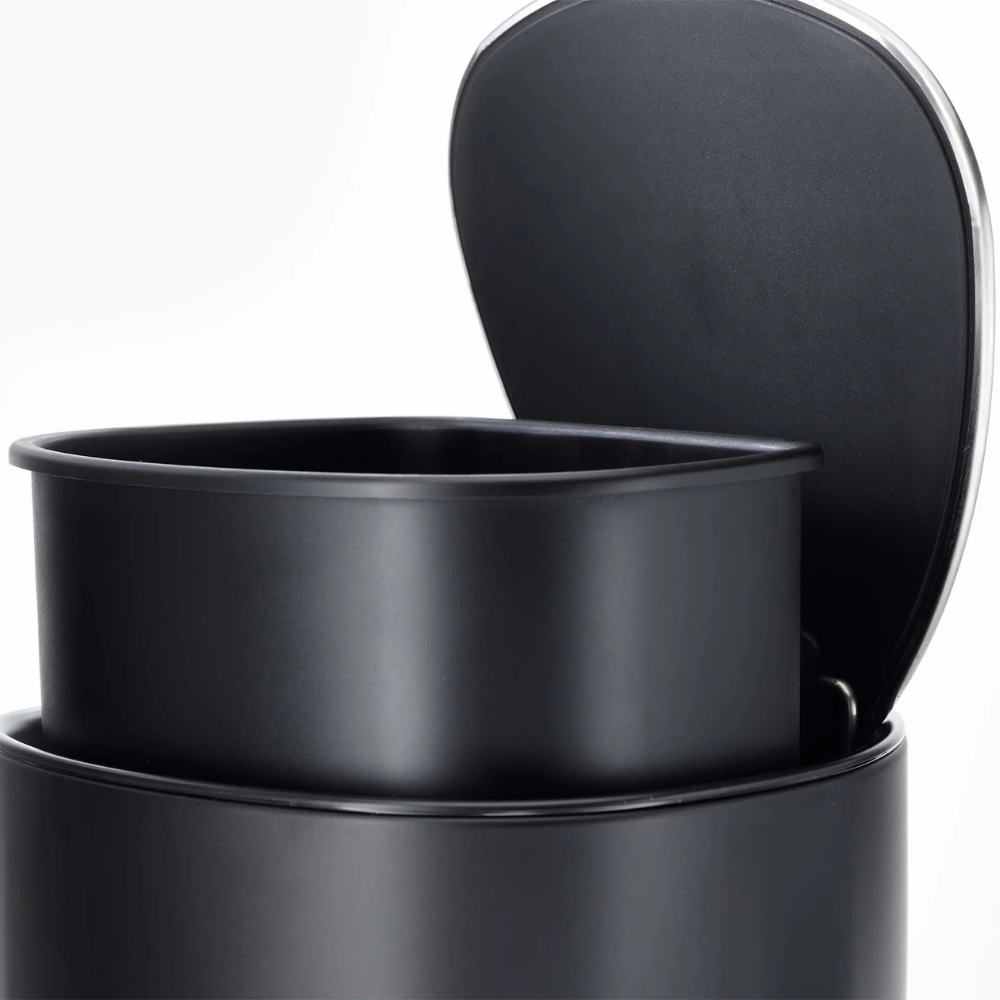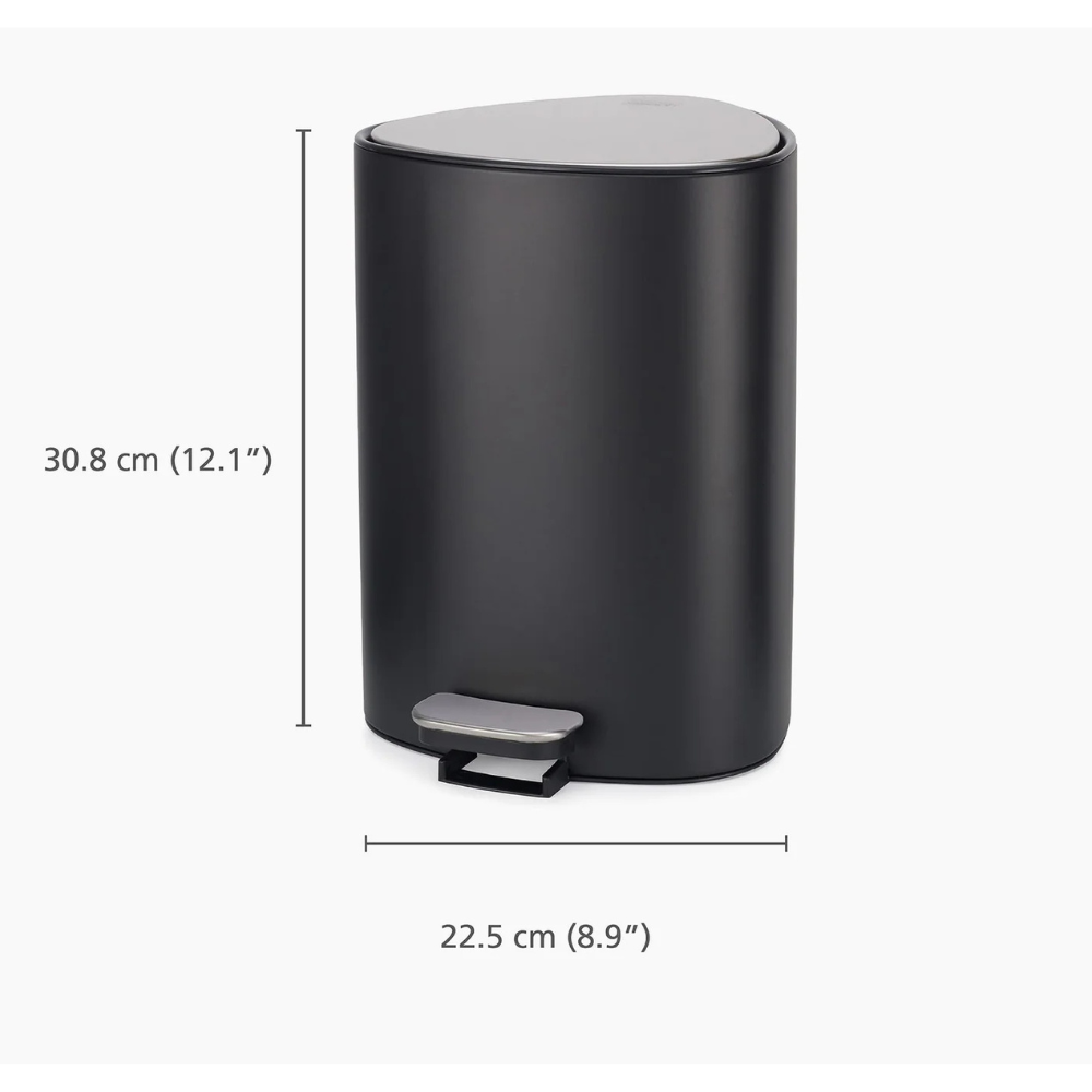 - The pocket on the back is ideal for storing a roll of Joseph Joseph IW8 fitted bin liners. The inner bucket is removable for easy emptying whenever needed. Stylish and durable steel construction with an attractive matte black finish. Stainless steel lid and pedal with a soft-close mechanism. Spacious 5-liter capacity, ideal for a variety of spaces, including bathrooms, offices, and bedrooms.