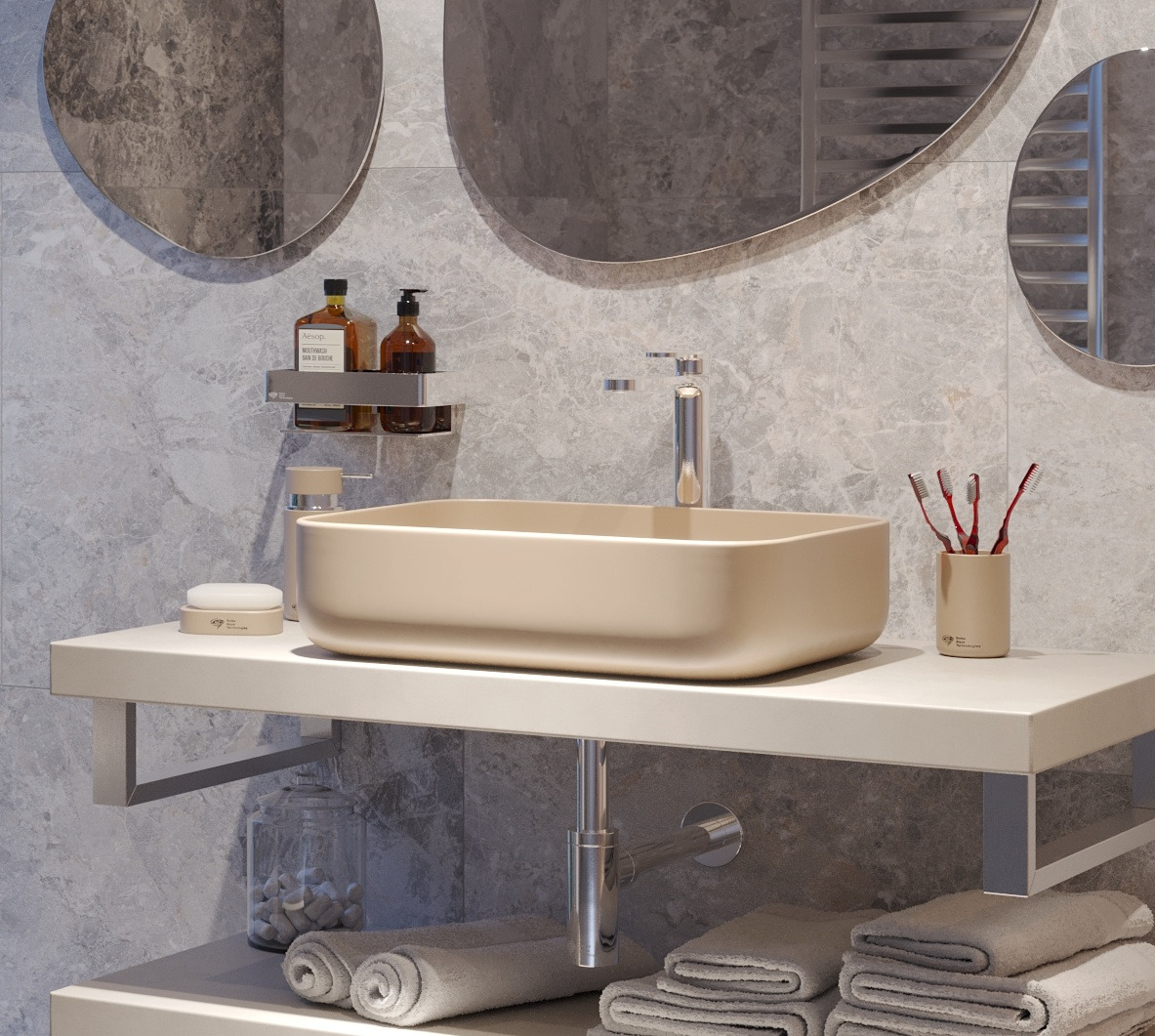 Infinitio countertop washbasins are manufactured differently from standard ceramic washbasins. Their production requires the use of a different material and a much higher firing temperature.