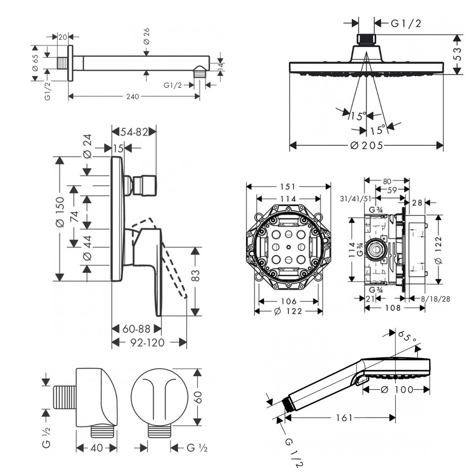 Features of the All-in-1 shower set with 2 spray hand shower + arm and 20cm head shower, matt black :