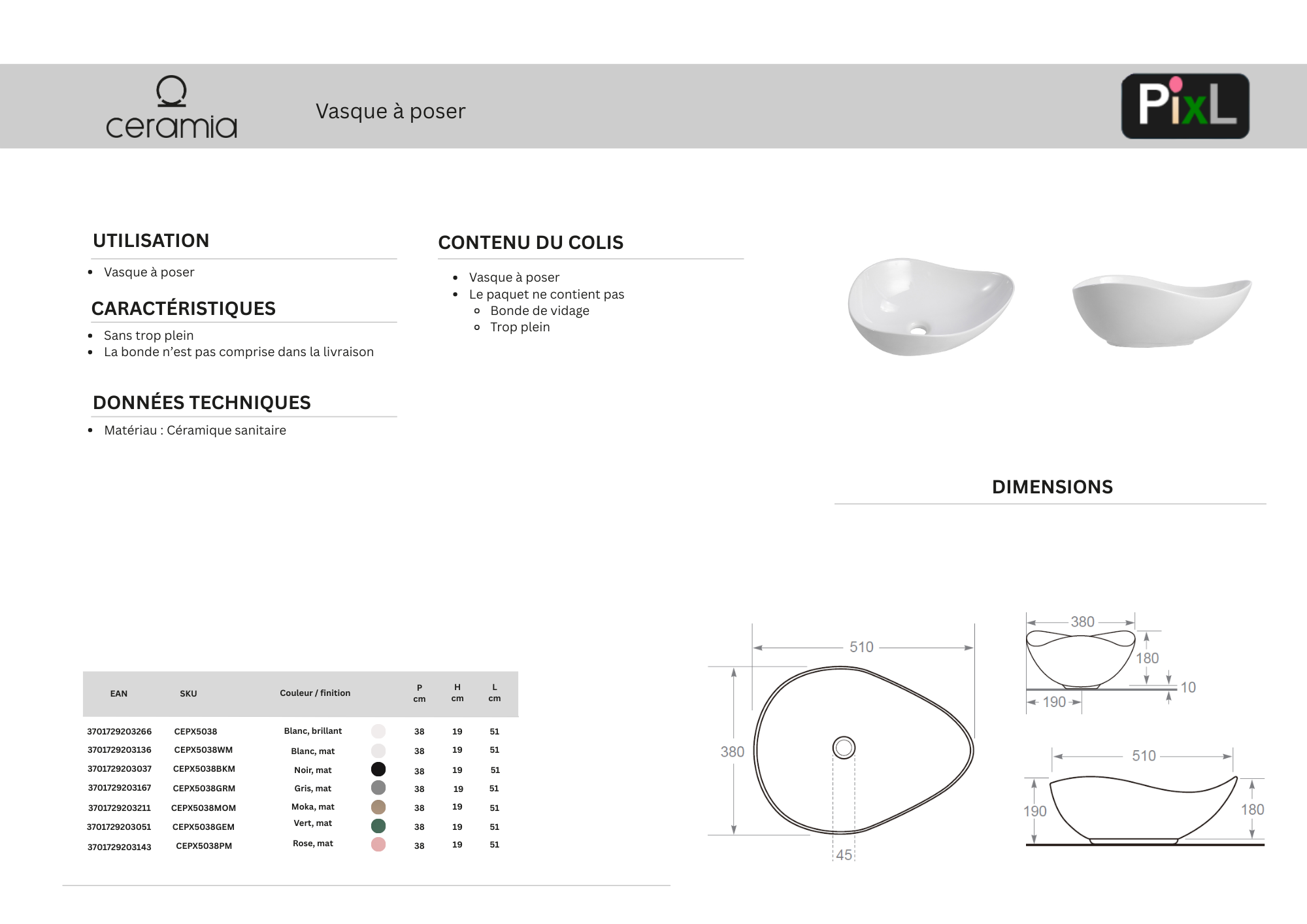 PixL 50.5 x 38 x 18 cm Infinitio countertop basin, without overflow, white (CEPX5038):