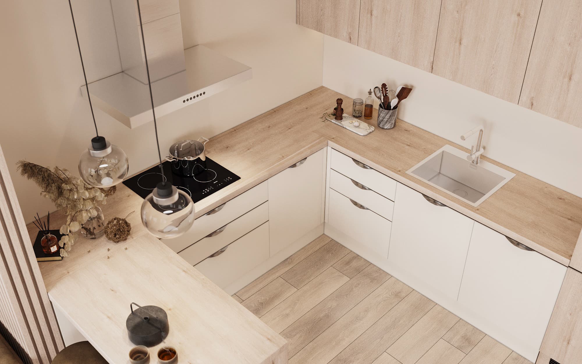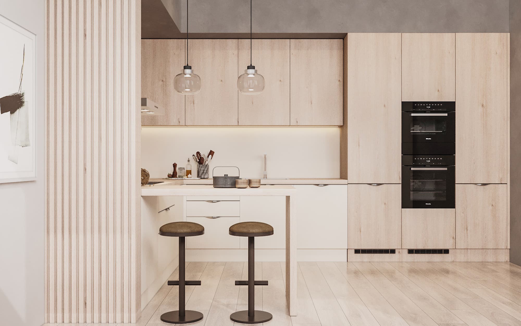 In a Japandi kitchen, every element is designed to create a calm and minimalist atmosphere. The lines are simple, the materials natural, and the colours soft and neutral. Light wood, used throughout, gives the space a sense of lightness. Combined with matte fronts in shades of ivory or grey, it creates a bright and soothing environment.