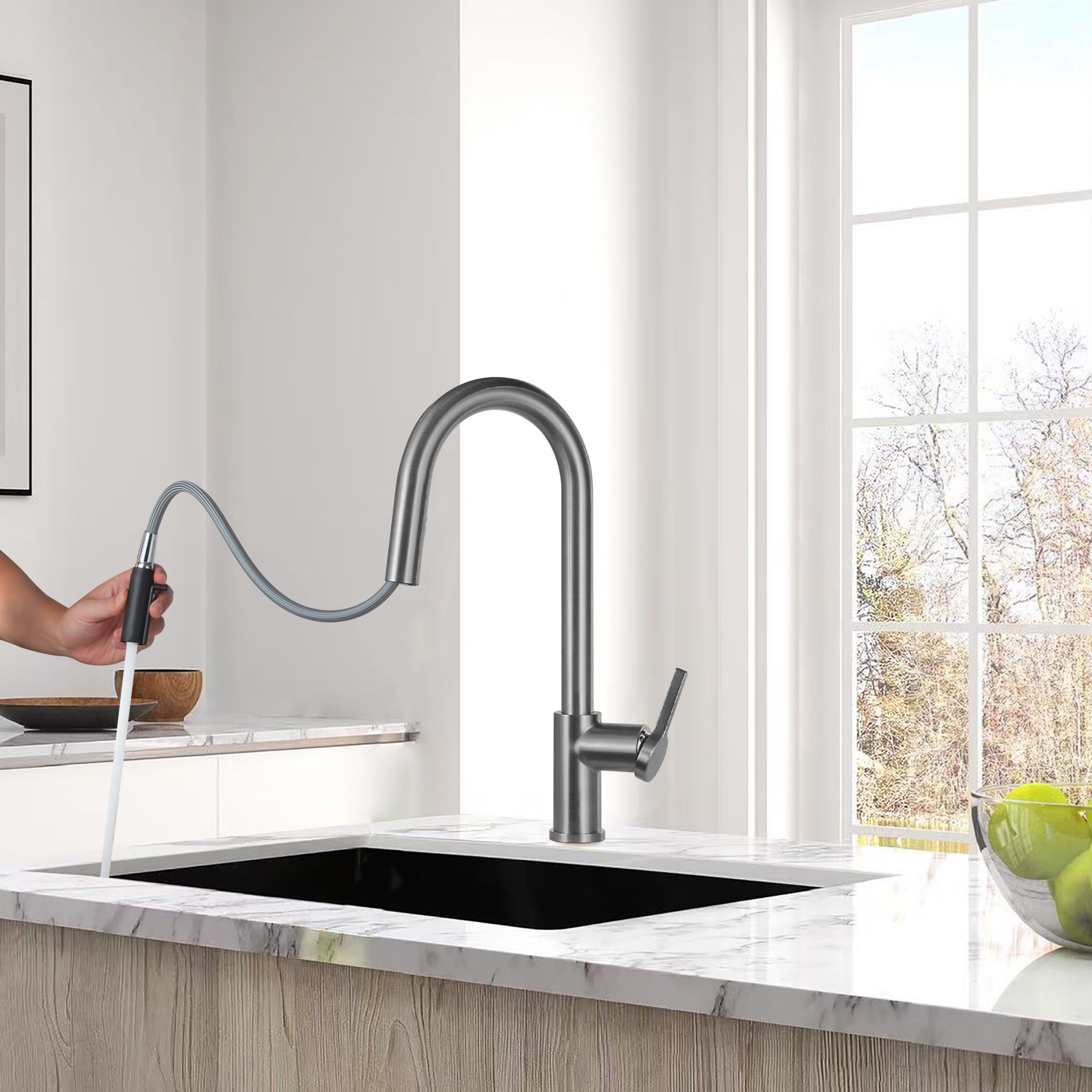 Timeless stainless steel lever sink mixer with pull-out spray, single-hole, brushed gun metal (TMLKF285BGM):
