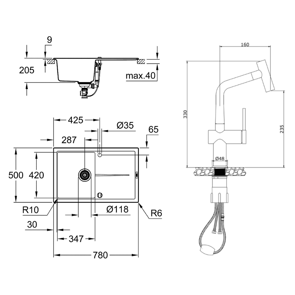 - Installation: Drainer on the left or right