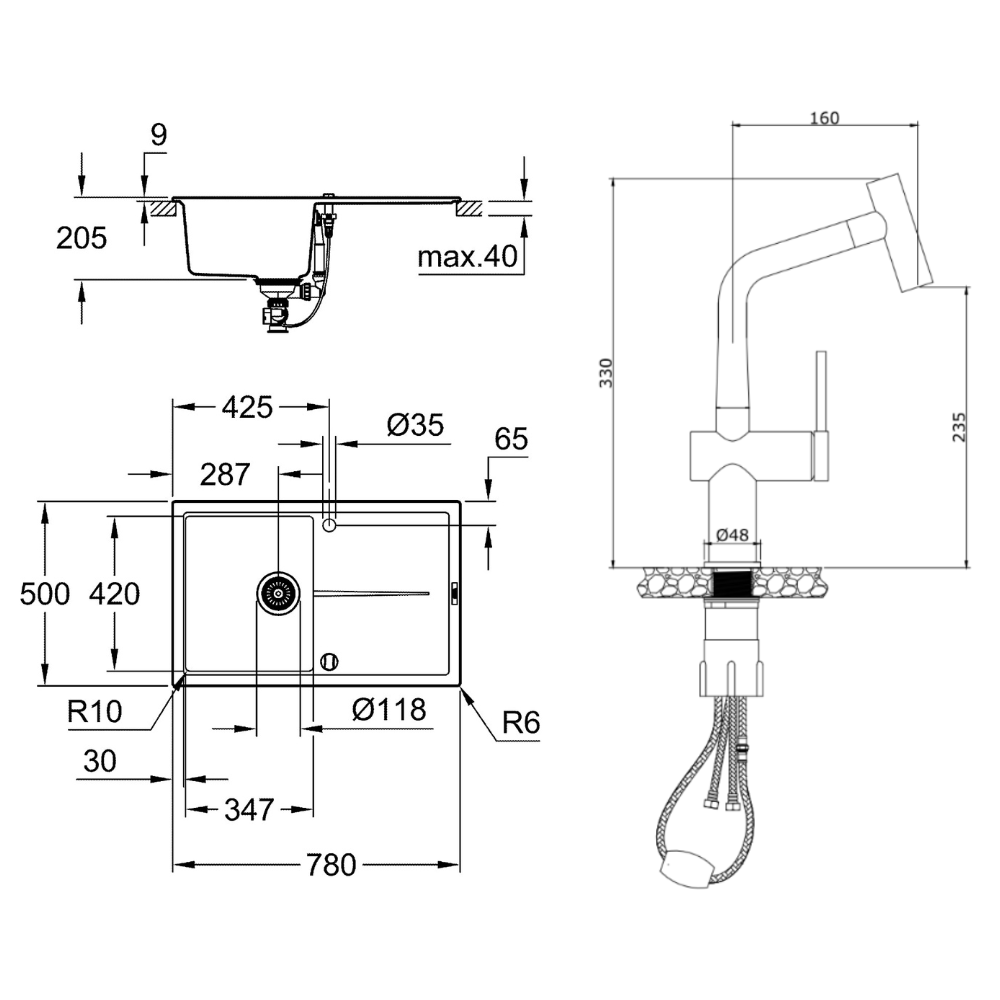 Features of the Grohe K400 Quartz Composite Sink with Reversible Drainer 780x500 mm + Ceramia Timeless Mixer Tap (G31639TML1BG-SET):