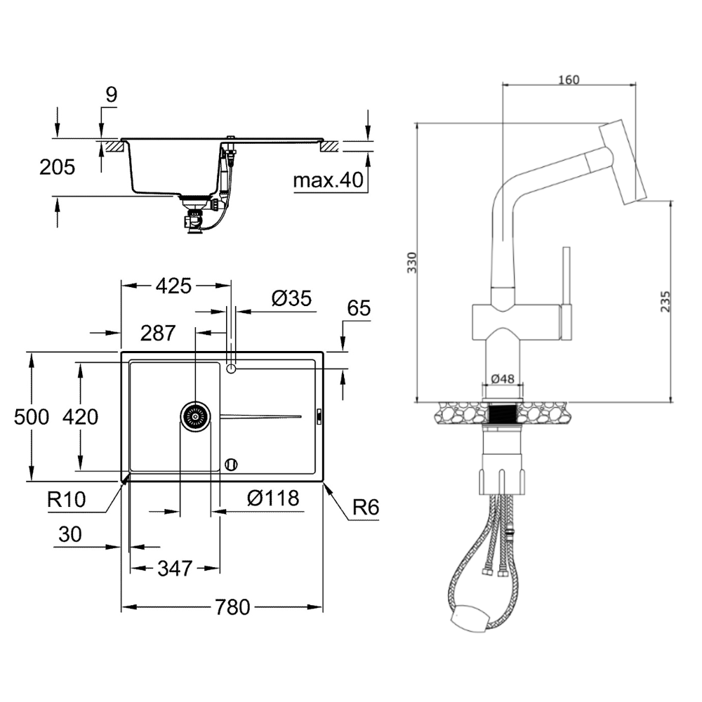 Features of the Grohe K400 Quartz Composite Sink with Reversible Drainer 780x500 mm + Ceramia Timeless Mixer Tap (G31639TML1BCP-SET):