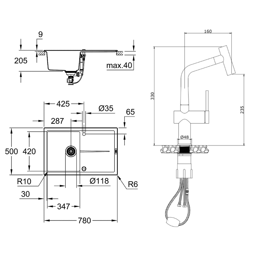 Features of the Grohe K400 Quartz Composite Sink with Reversible Drainer 780x500 mm + Ceramia Timeless Mixer Tap (G31639TML1BM-SET):