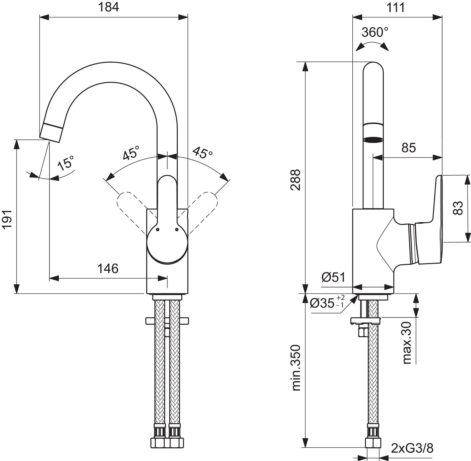 - Tap with high swivel spout and removable aerator.