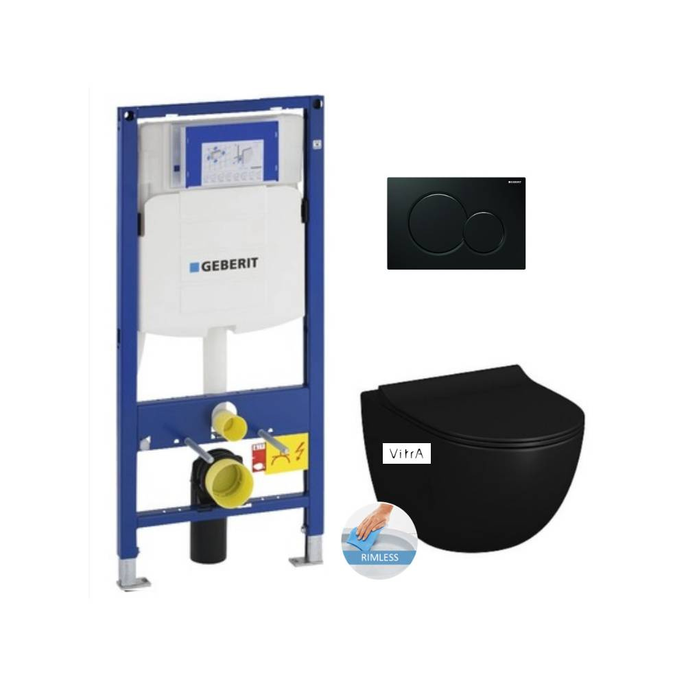 Opt for the quality and ease of installation of the Toilet Set Support frame + Vitra SENTO Black rimless bowl invisible fixings + Seat + Black plate (GebBlackSento-A).