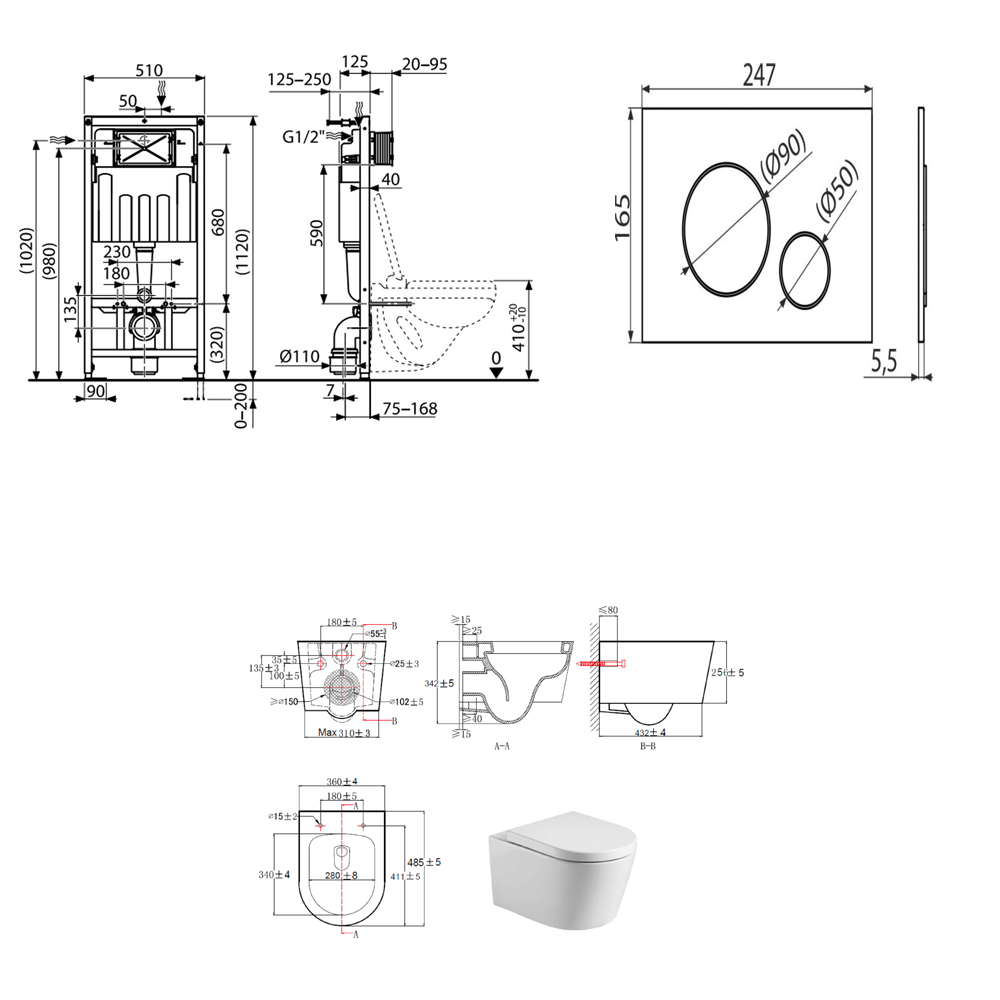 - For the installation of a wall-hung toilet with a connection distance of 180 mm or 230 mm
