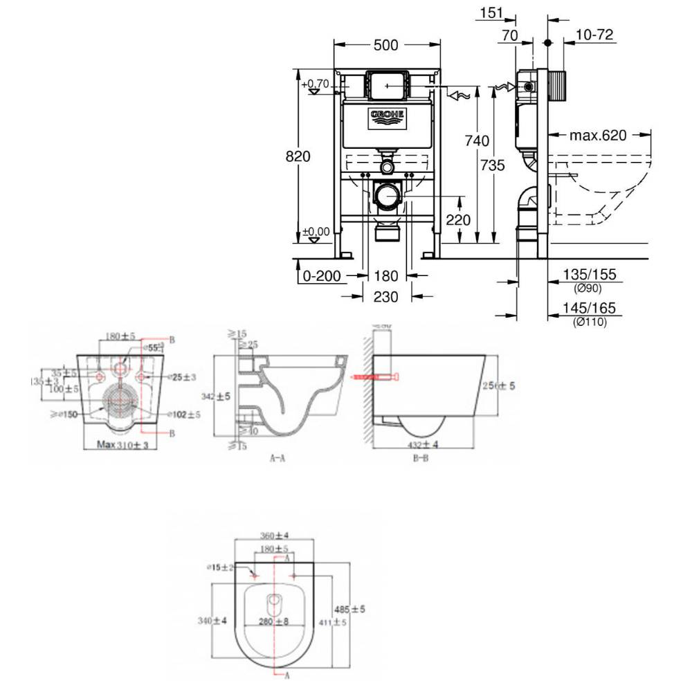 Grohe 0.82m low height Rapid SL frame + Black SAT rimless bowl + Grohe brushed gold flush plate