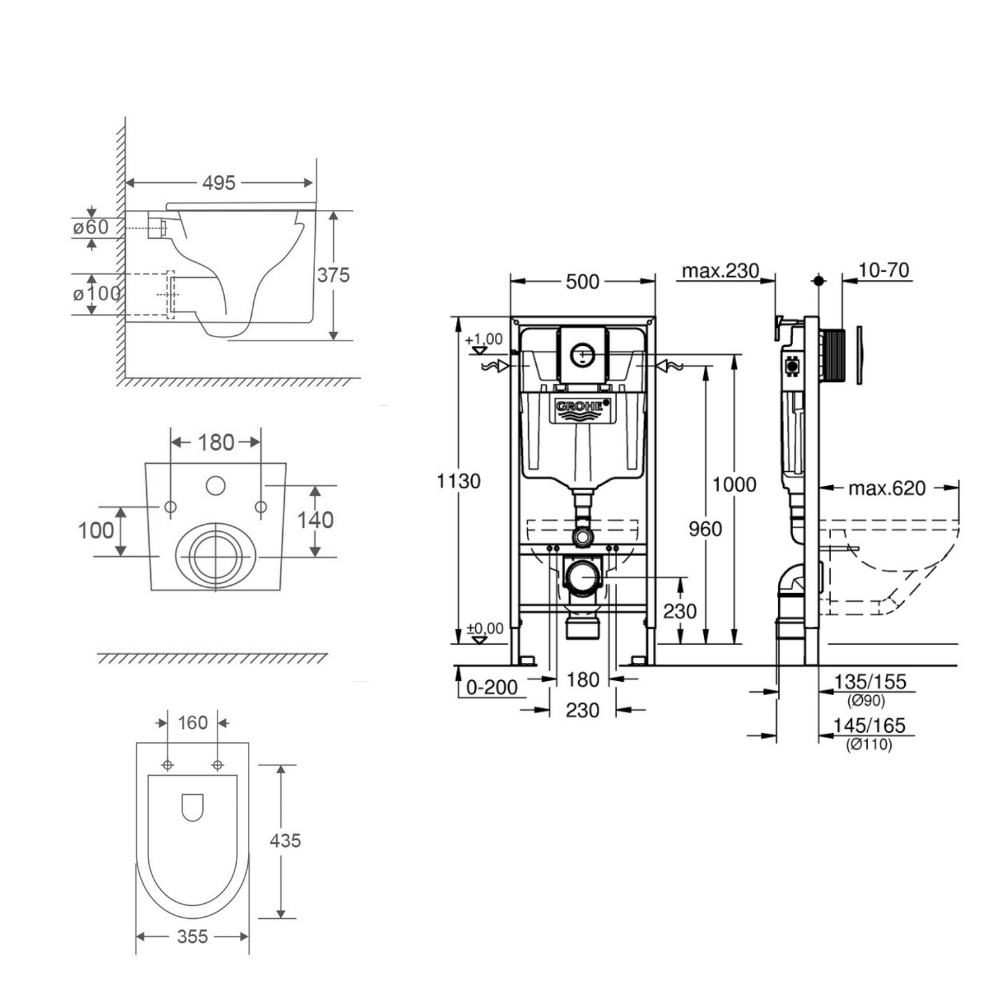 - Grohe Solido 4-in-1 wall-mounted toilet kit, 1.13 m concealed frame, dual flush, Fresh system + chrome plate (G39978000)