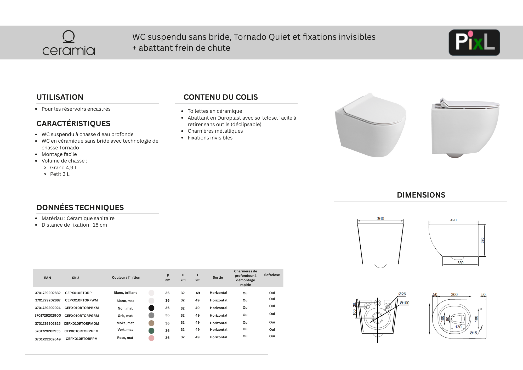 Matte black stands for elegance and luxury. The PixL CEPX010RTORPBKM, wall-mounted toilet in matte black, adds a sophisticated touch to your bathroom. Its rimless design simplifies cleaning and guarantees perfect hygiene, while the technology Tornado Quiet ensures a quiet and highly efficient flush while consuming less water than conventional systems (3/6 l).
