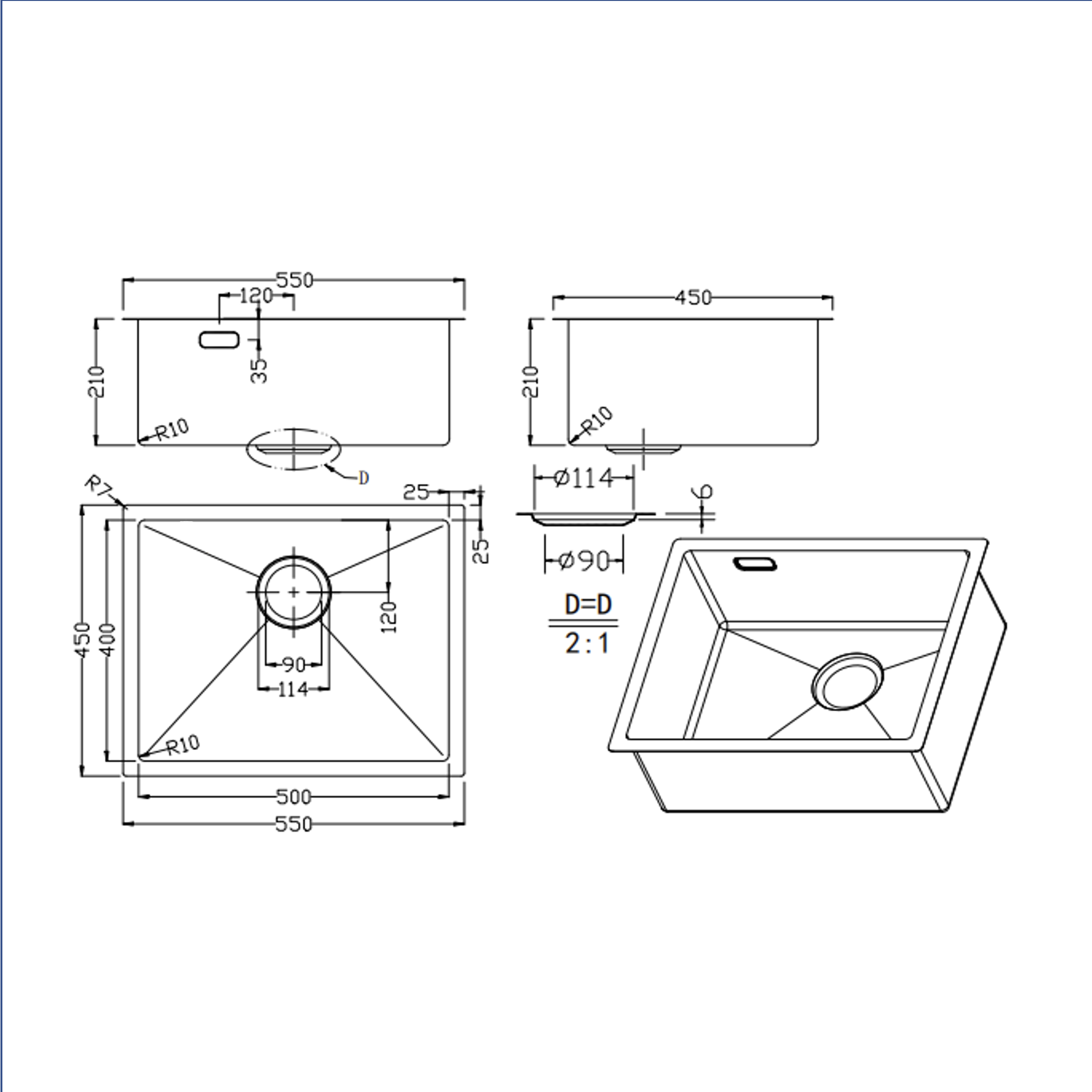 Features of the undermount sink in stainless steel 304, 55x45x21 cm, with overflow, Gun Metal PVD (TMLKSU-5545BGM):