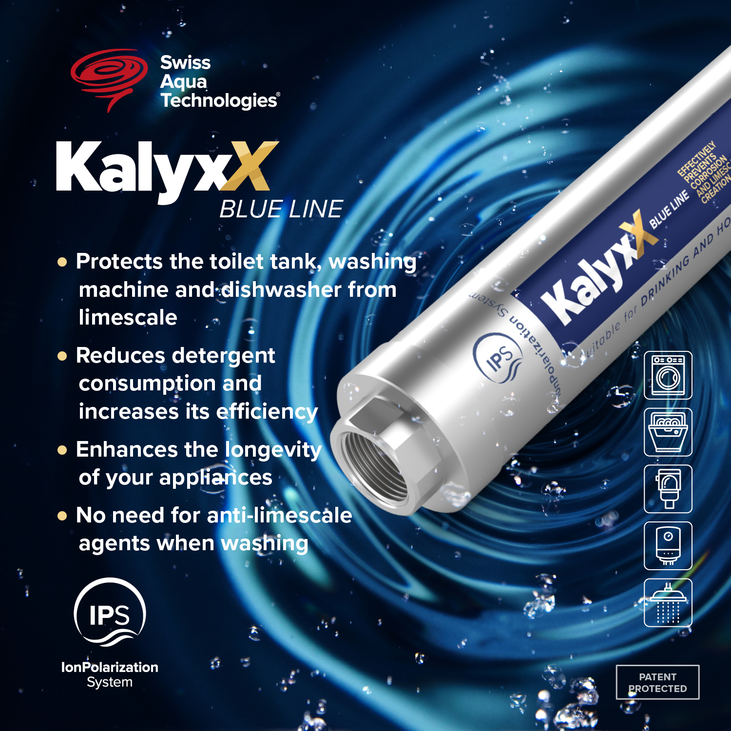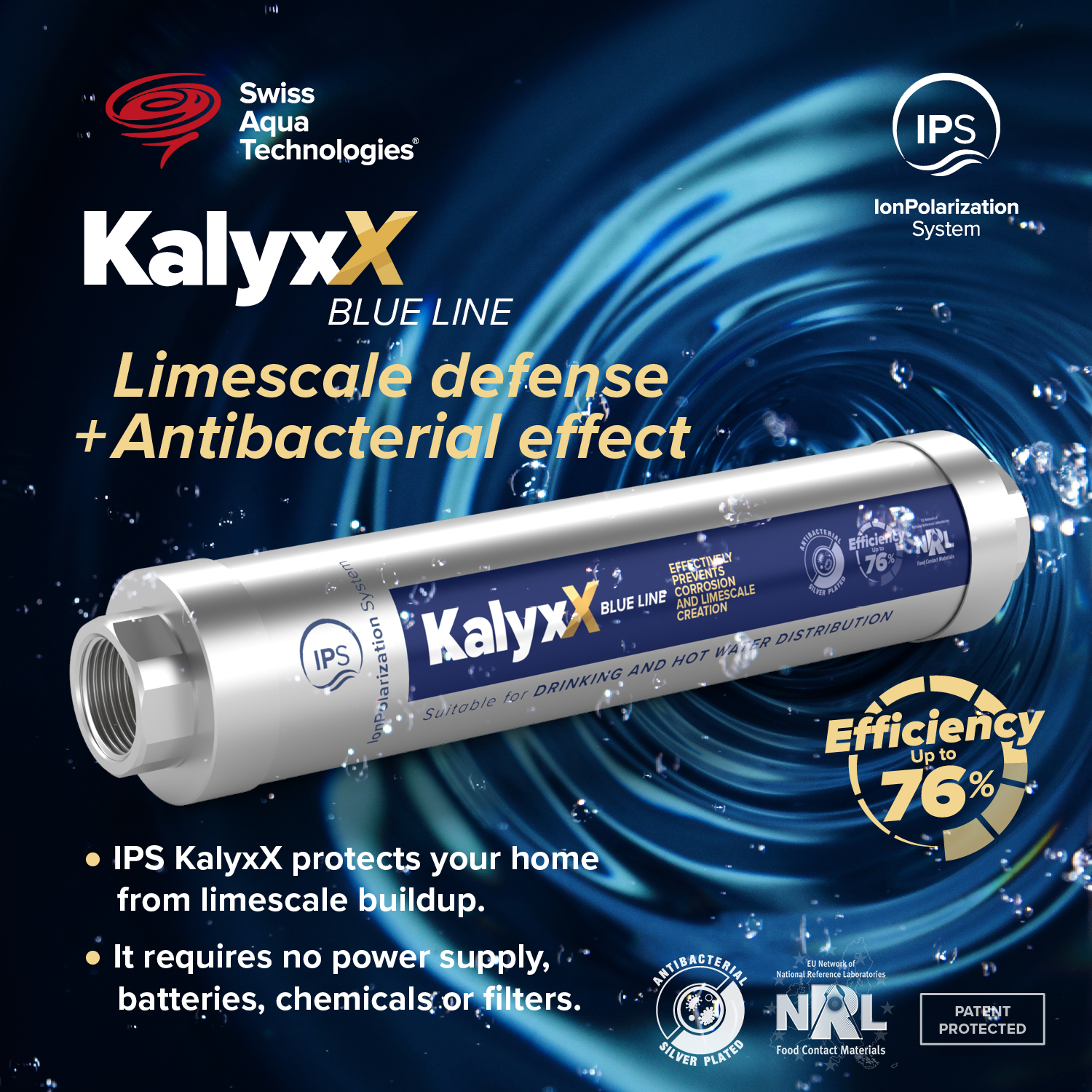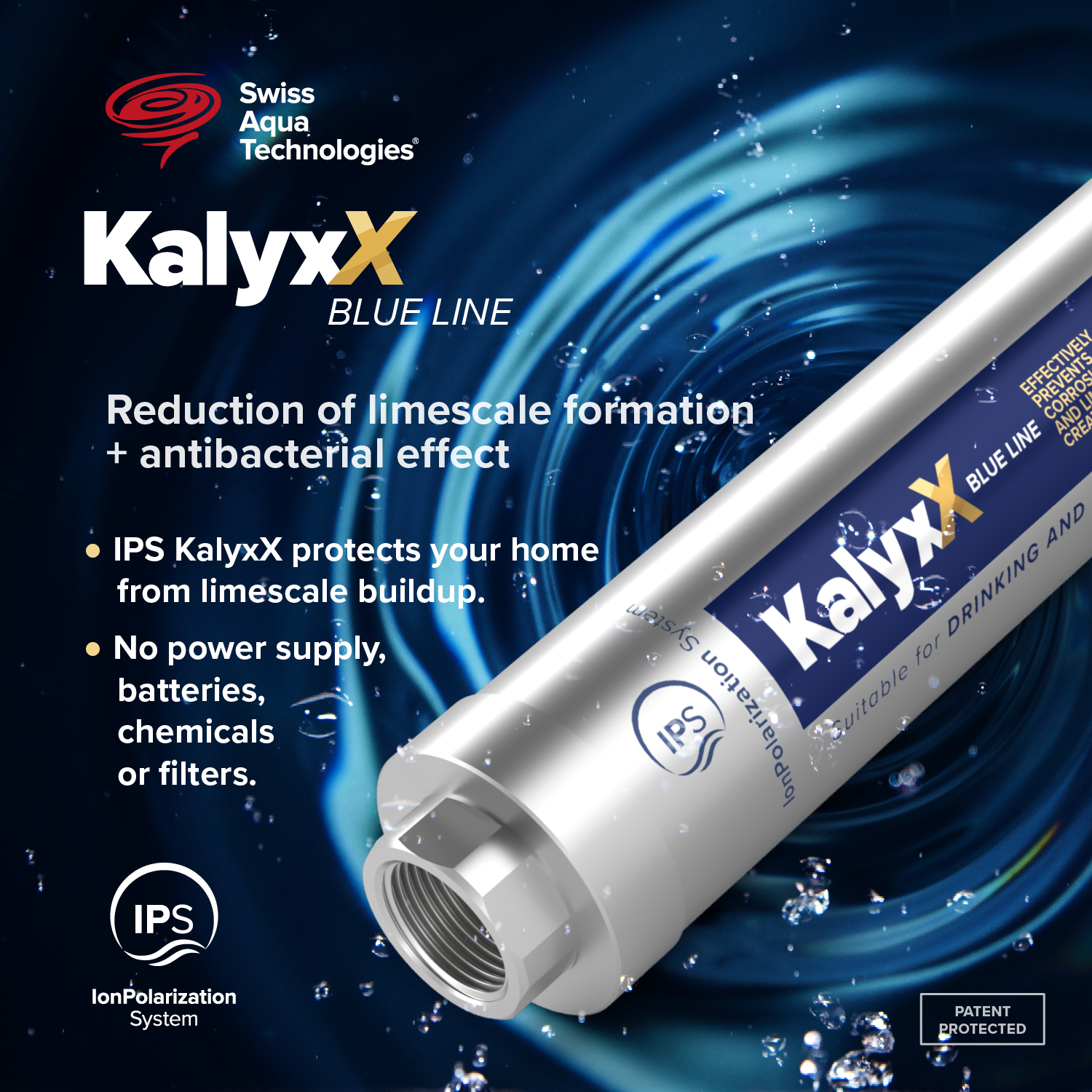 IPS KalyxX brings a major advancement to water treatment by harnessing galvanic wet cell technology. When water passes through this device, an internal electrical tension is triggered, generating a force field. This action takes place safely within an insulated casing.